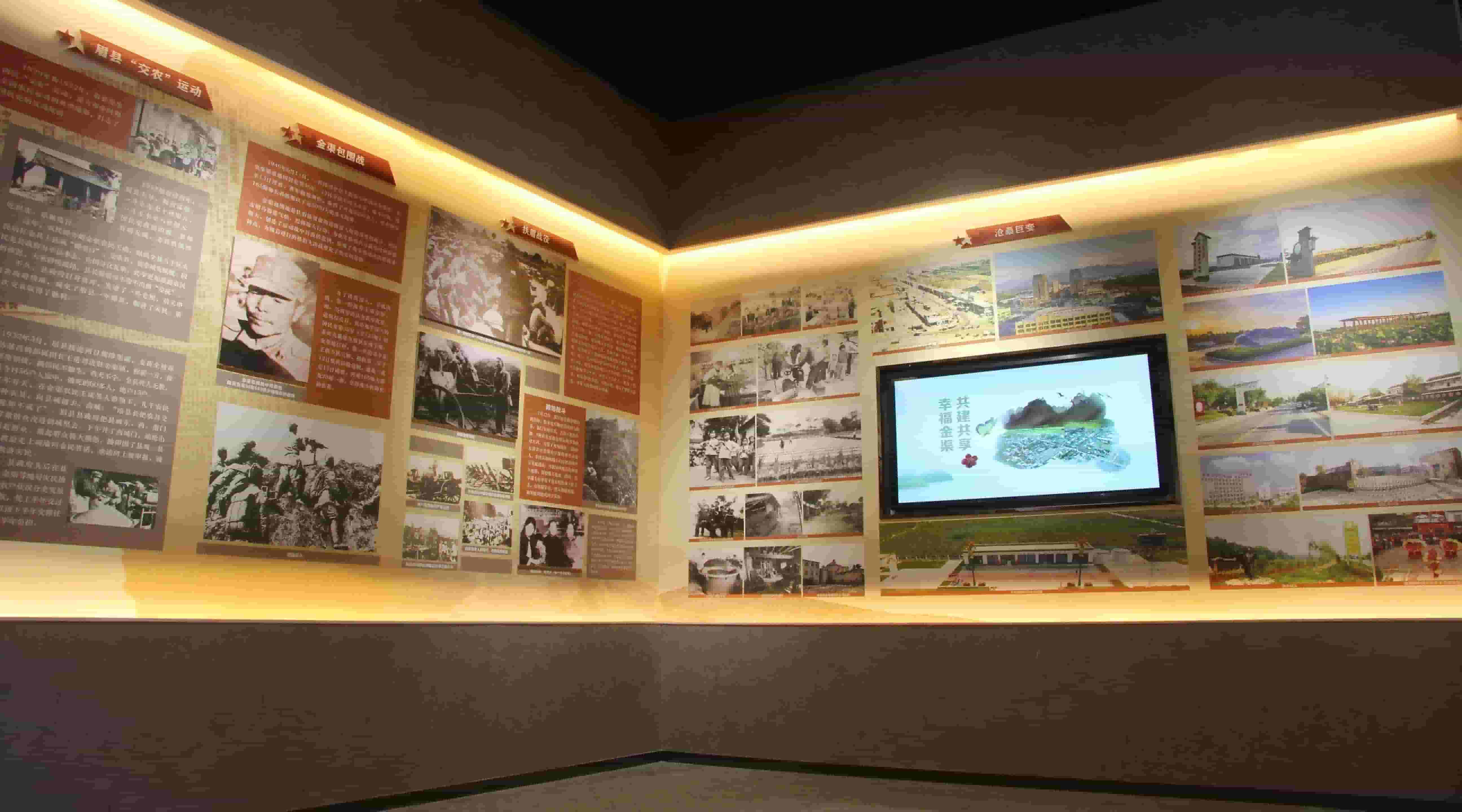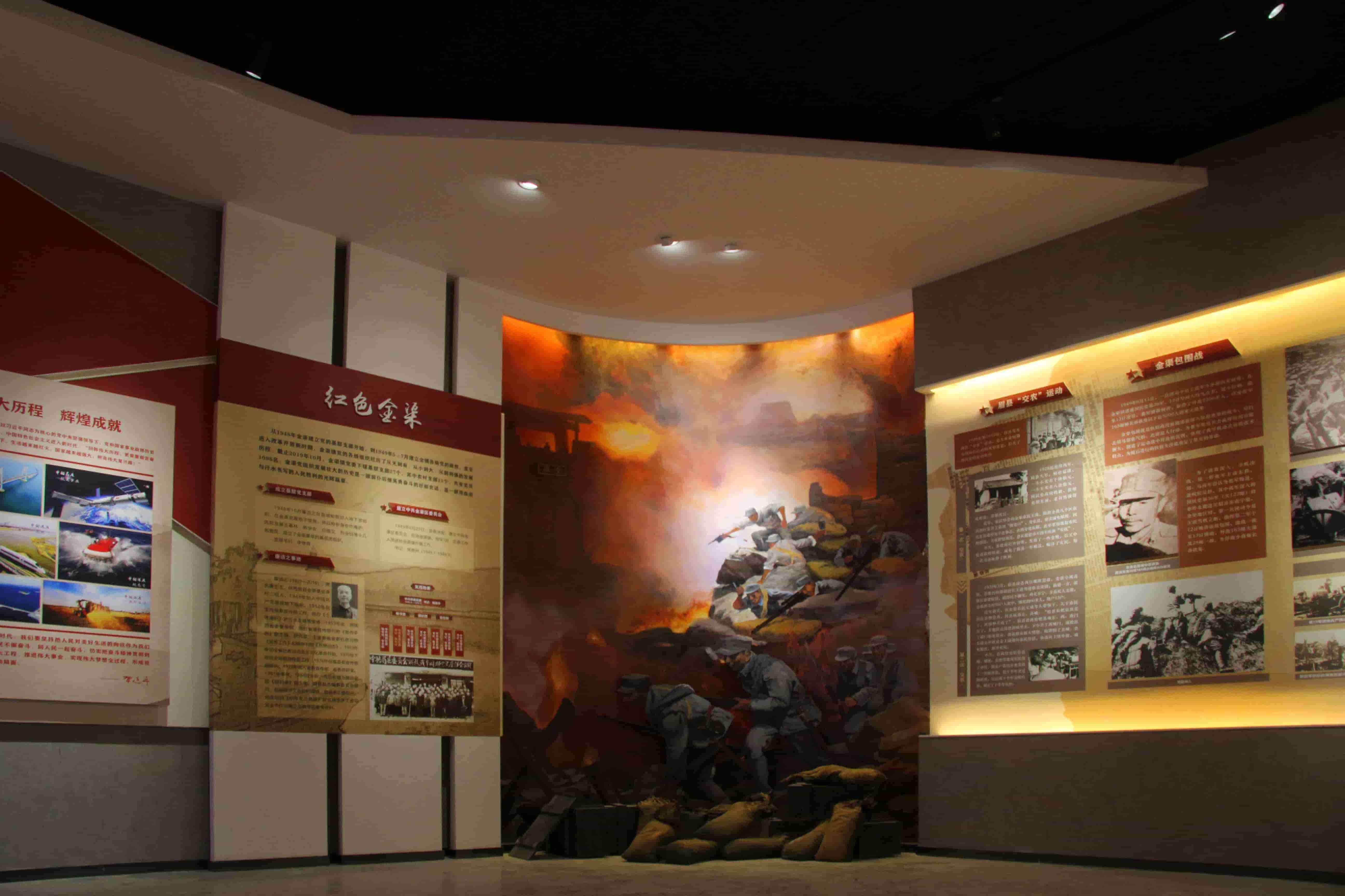 墙面展板通过图文方式展示了金渠古镇人杰地灵的灿烂文化和历史荣耀,同时通过半景画场景搭建引出红色金渠的革命史、沧桑巨变发展史,搭载电子触摸屏,通过互动形式了解关于金渠更多红色历史。