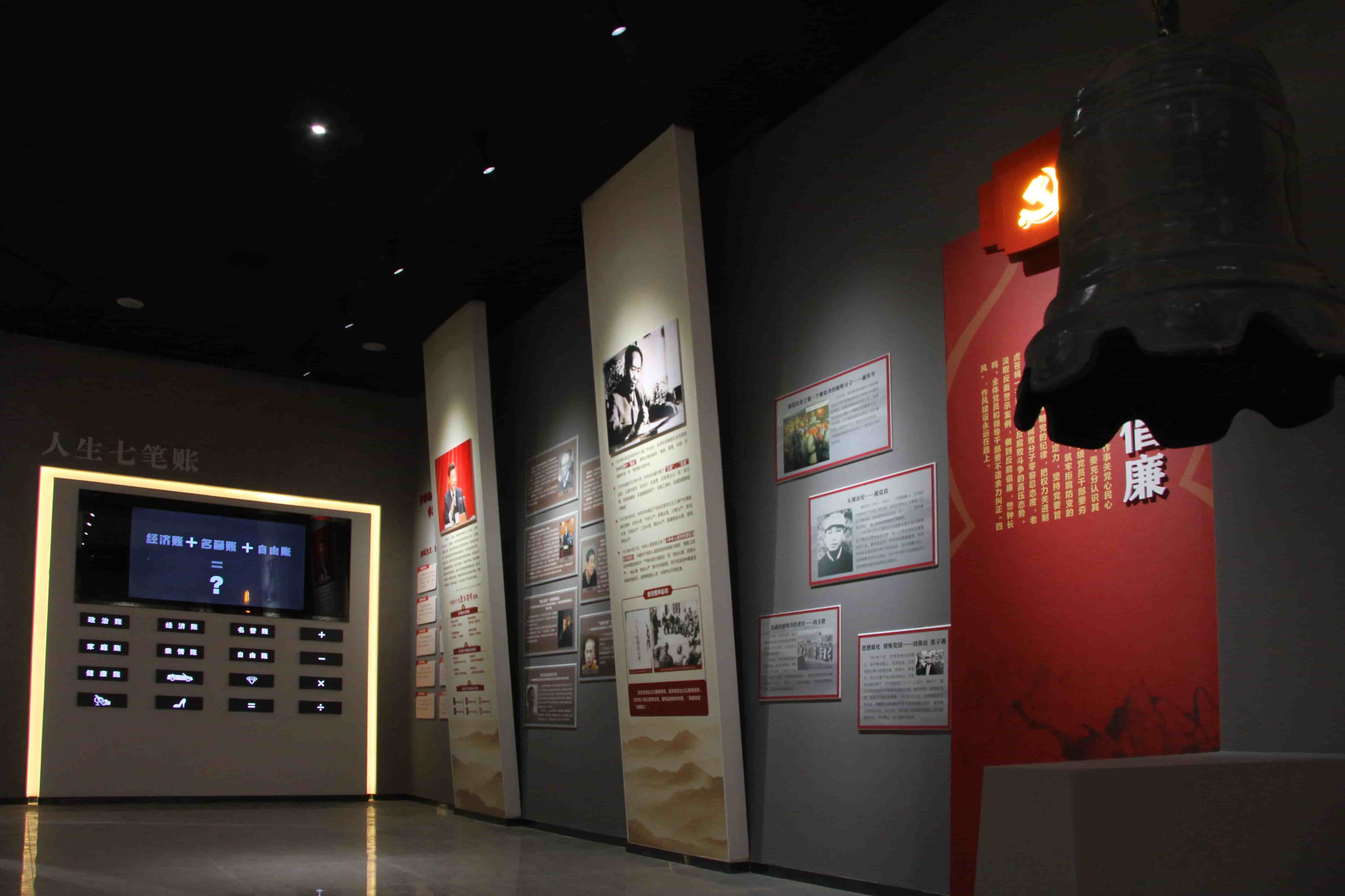 墙面展板重点展示党的十八大以来,以习近平同志为核心的党中央在推动党要管党、全面从严治党方面取得的成效,通过反面案例教育广大党员干部廉洁自律,同时借用人生七笔账互动,让警示教育更加深入人心。